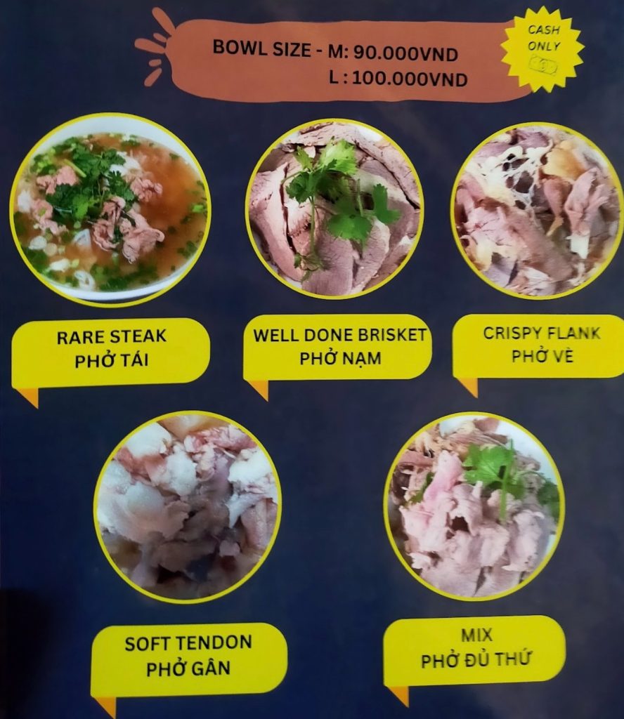 フォー1杯の値段は小サイズで90000VND(450円)〜。